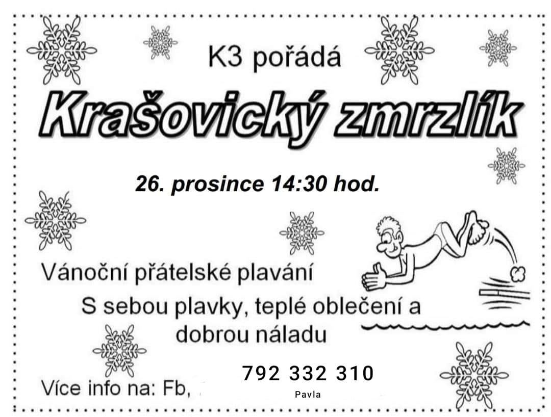 Zveme vás na Vánoční přátelské plavání, které se koná 26. prosince 2025 od 14:30. Přijďte si užít příjemné odpoledne u vody s přáteli a rodinou. Nezapomeňte si vzít plavky, teplé oblečení a dobrou náladu. Těšíme se na vaši účast.
